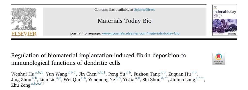 2022年2月26日,基础医学院曾柱教授领衔的PI团队在Materials Today Bio杂志上发表了题为Regulation of biomaterial implantation-induced fibrin deposition to immunological functions of dendritic cells的研究论文。该研究发现,DCs能够响应局部病理微环境和力学微环境,表现出明显的形态改变和细胞骨架重构,并获得相应的免疫表型和力学表型,其力学-化学耦合机制涉及RhoA和CDC42信号通路。这项工作不仅有助于更好地理解植入生物材料引发的免疫反应的精确过程,而且对生物材料的合理设计具有重要意义。