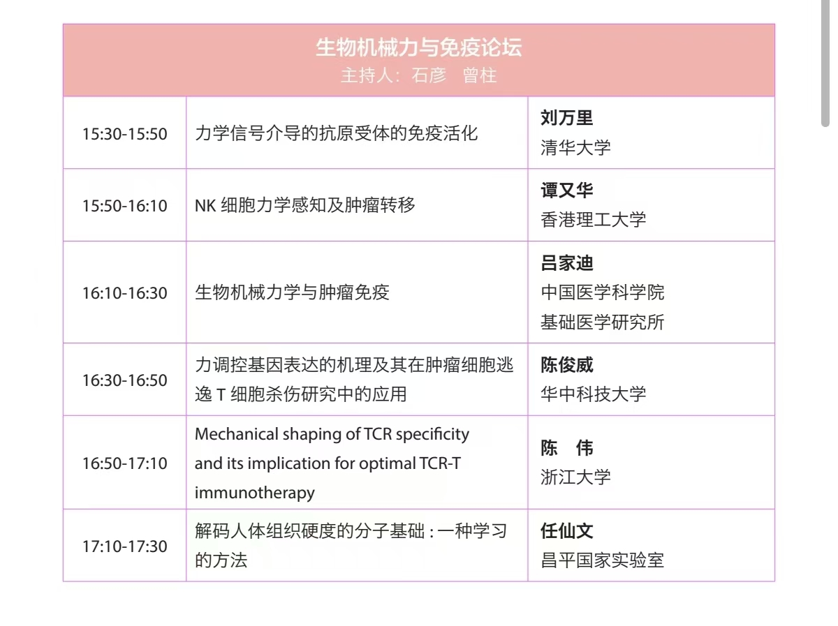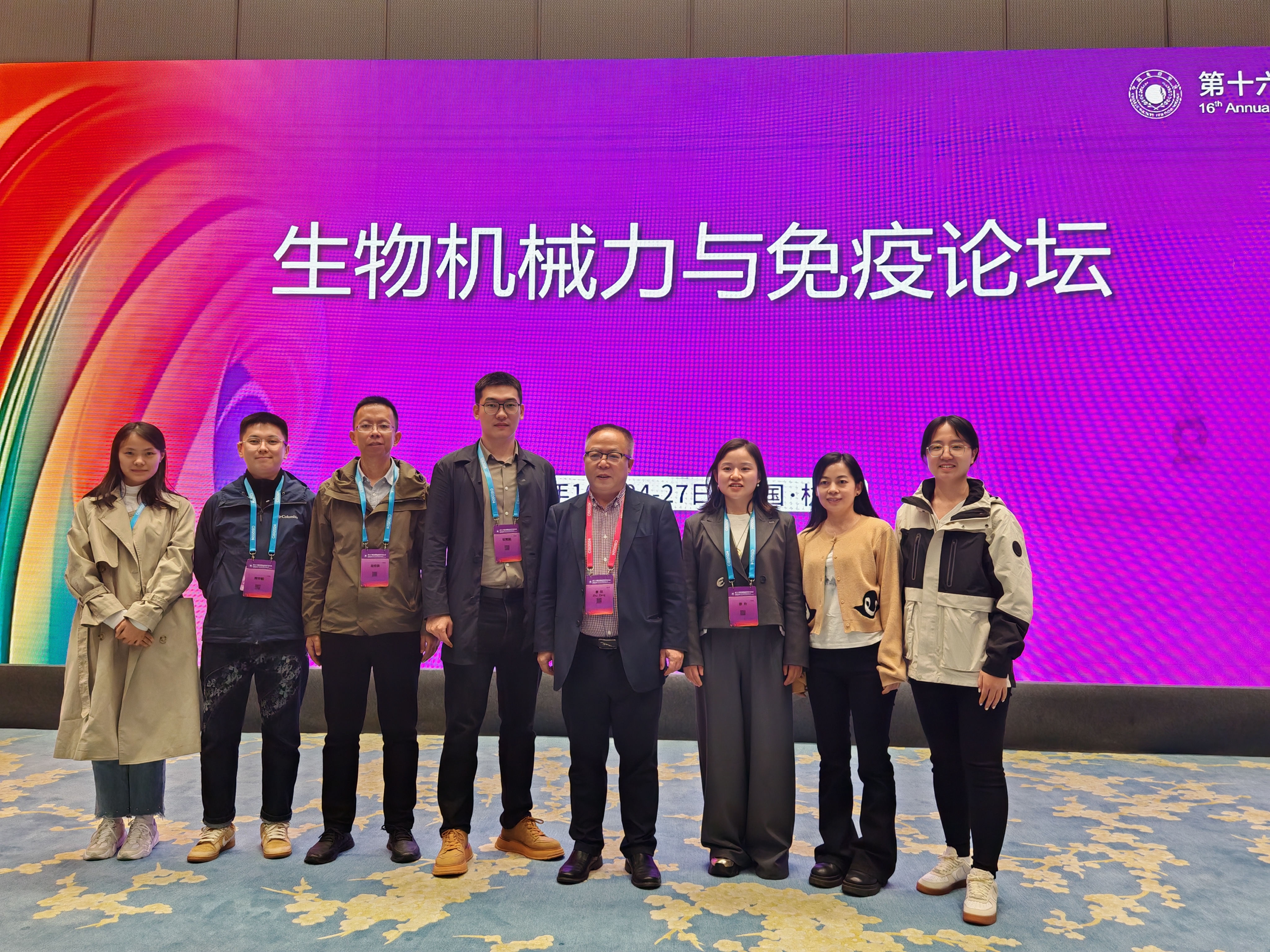 2024年10月24日至27日,曾柱教授带领团队的博士研究生参加第十六届全国免疫学学术会议(杭州)。曾柱教授受邀并主持特色论坛---生物机械力与免疫论坛。
